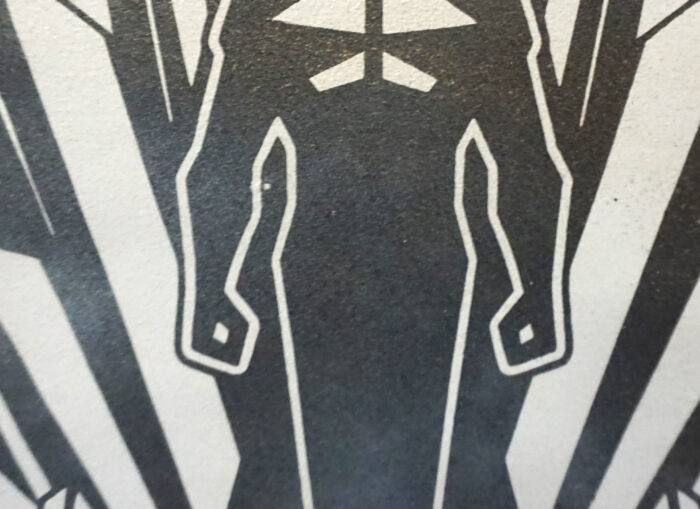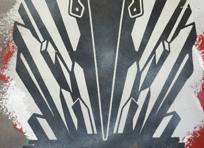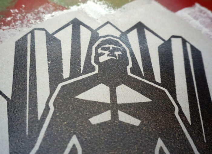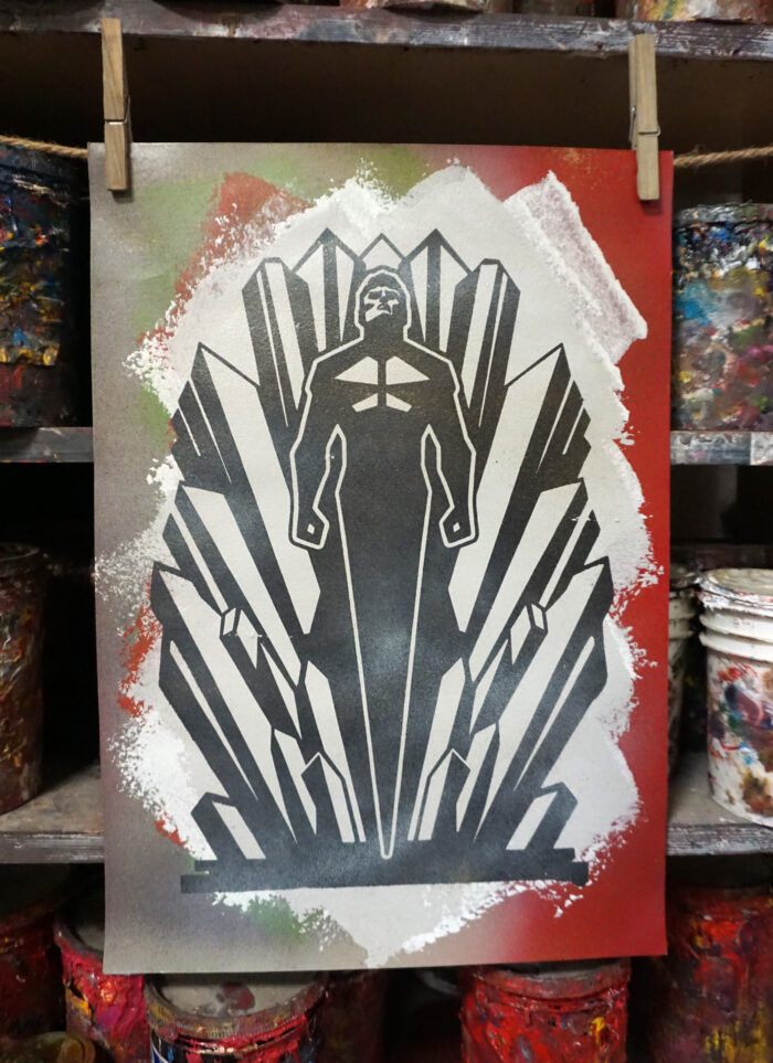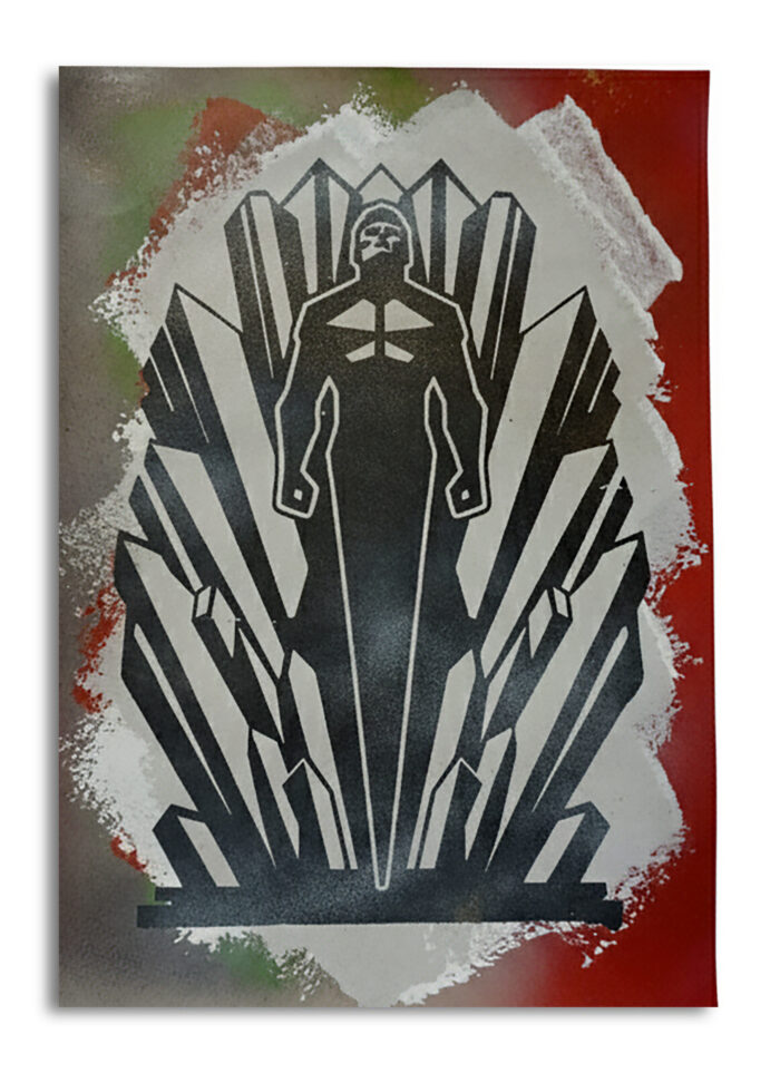 La figura centrale, stilizzata e ascendente, sembra emergere da una corona di cristalli geometrici. L’immagine è stampata a mano in serigrafia su uno sfondo creato con rullo, schizzi d’inchiostro e bomboletta spray, per un effetto materico e dinamico. Ogni copia è diversa: le sfumature e le tracce manuali rendono ogni esemplare un pezzo unico.